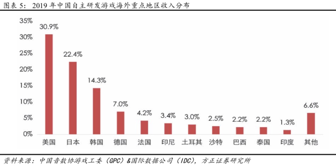 从市场收入占比看:2019年我国自主研发游戏国内外市场收入约2700亿元,其中海外市场达825.2亿元,占比30.6%。其中美国地区在中国自主研发游戏海外重点地区收入占比为30.9%,计算可得美国地区在中国整体游戏收入比重为9.4%。
