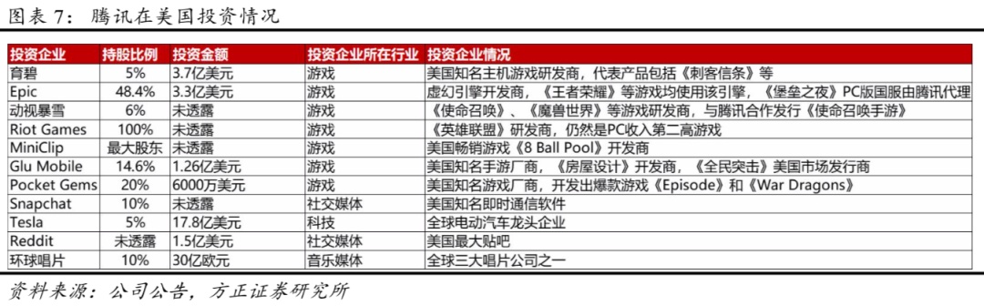 4、腾讯在美投资情况:腾讯在美国投资多集中在文娱传媒领域。投资游戏企业包括:育碧(持股5%)、Epic Games(持股48.4%)、动视暴雪(持股6%)、Riot Games(持股100%)、MiniClip(最大股东)、Glu Mobile(持股14.6%)、Pocket Gems(持股20%);社交媒体平台:Snapchat(持股10%)、Reddit(1.5亿美元);音乐媒体:环球唱片(持股10%);科技企业:特斯拉(持股5%)。