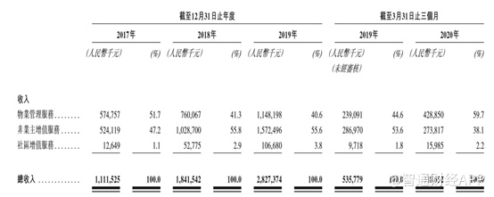 招股书显示,2019年,公司物业管理服务实现营业收入11.48亿元,占公司总营业收入的40.6%;非业主增值服务实现营业收入15.72亿元,占公司总营业收入的55.6%。