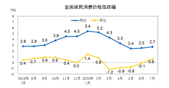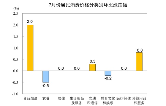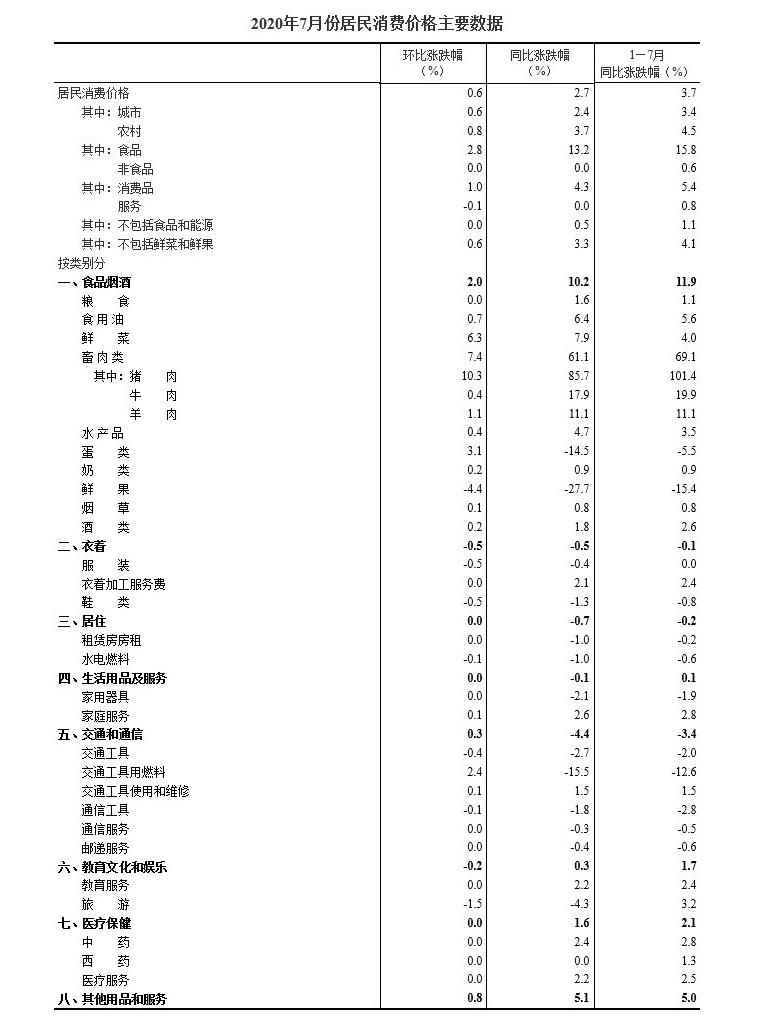 7月份,全国居民消费价格环比上涨0.6%。其中,城市上涨0.6%,农村上涨0.8%;食品价格上涨2.8%,非食品价格持平;消费品价格上涨1.0%,服务价格下降0.1%。