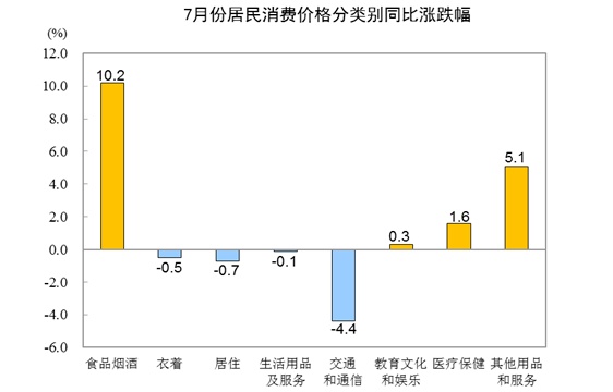 7月份,食品烟酒类价格同比上涨10.2%,影响CPI(居民消费价格指数)上涨约3.07个百分点。食品中,畜肉类价格上涨61.1%,影响CPI上涨约2.90个百分点,其中猪肉价格上涨85.7%,影响CPI上涨约2.32个百分点;鲜菜价格上涨7.9%,影响CPI上涨约0.19个百分点;水产品价格上涨4.7%,影响CPI上涨约0.09个百分点;粮食价格上涨1.6%,影响CPI上涨约0.03个百分点;鲜果价格下降27.7%,影响CPI下降约0.60个百分点;蛋类价格下降14.5%,影响CPI下降约0.09个百分点。