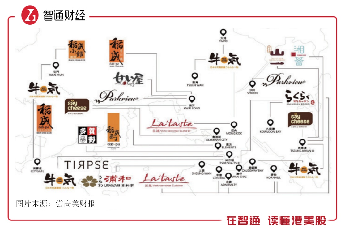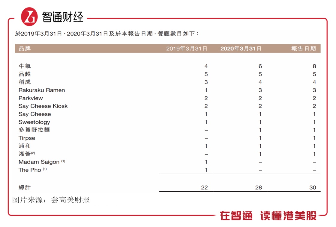 截止2020年3月31日,尝高美拥有28家餐厅,同比增加6家,其中牛气、品越、稻成、Rakuraku Ramen、Parkview、Say Cheese Kiosk分别有6家、5家、4家、3家、2家及2家,其余品牌均为1家。该公司重点发展牛气和稻成品牌,期间分别增加2家及1家,年内还推出了三个品牌,分别为湘荟、多贺野及Tirpse。