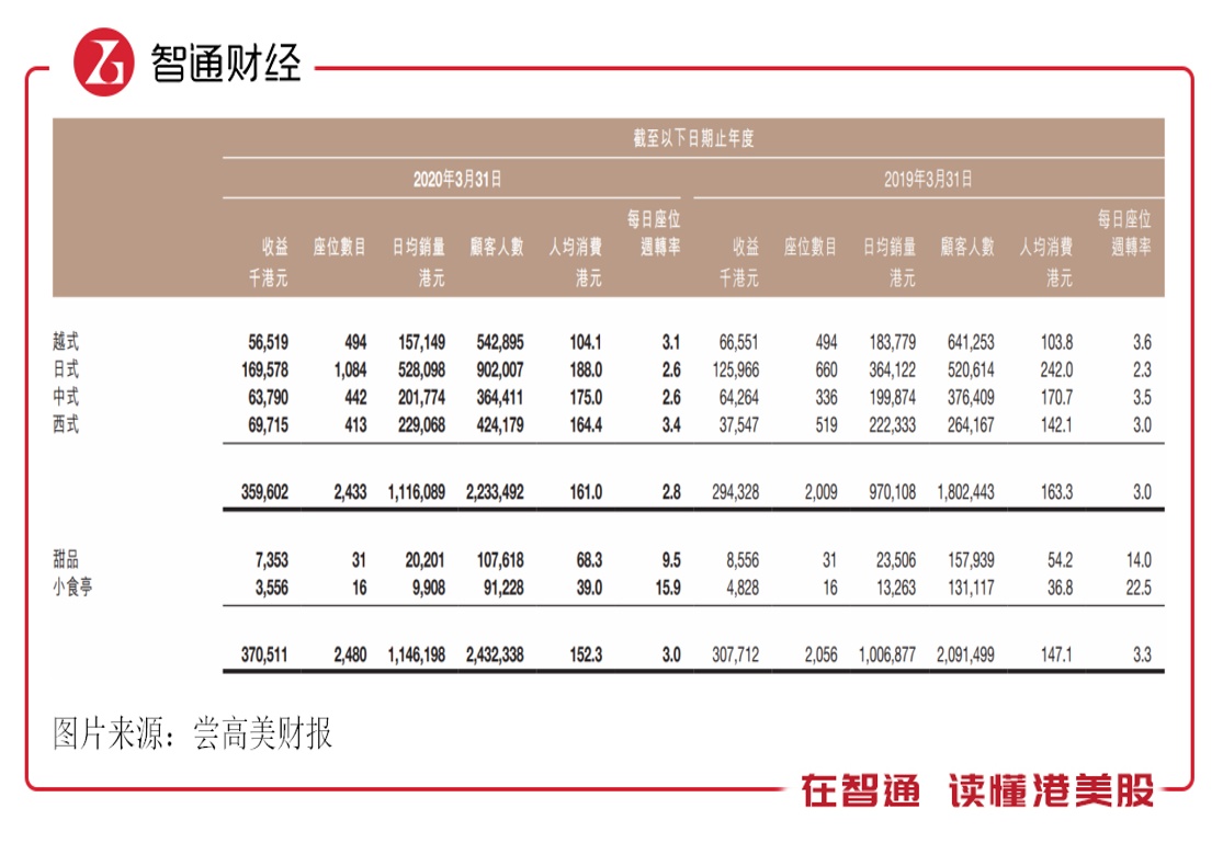 2019年及2020年,香港社会很不稳定,相继遭遇社会事件以及卫生事件,对于餐厅经营企业影响大,但似乎对尝高美影响不大。以季度看,2020财年Q1/Q2/Q3/Q4收入同比增长分别为58.6%、35.9%、13.65%及-13.7%。2020年第一季度,该公司顾客人数仅下滑17.6%,其中日式餐厅顾客竟然还增加,同比增长33.83%。