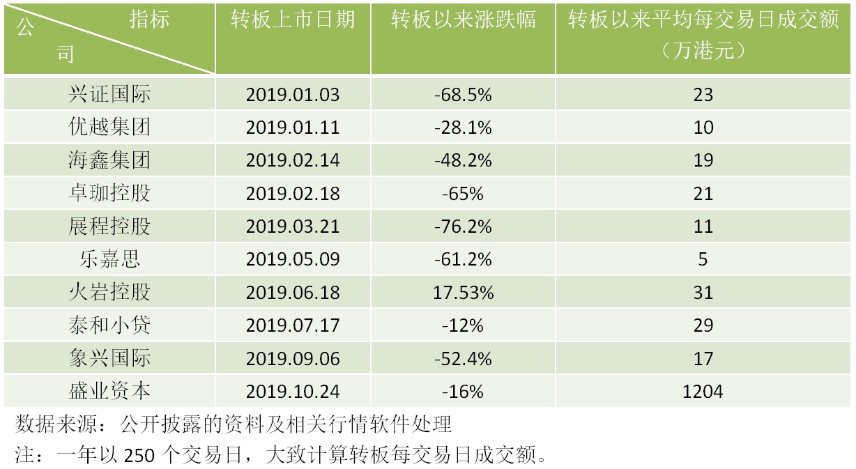 智通财经APP了解到,2019年全年从创业板转到主板上市的有20家公司,大部分公司首日收跌,转板以来大幅度下跌。我们抽样统计(2019)10家转板公司中,除了火岩控股(01909),其余九家不同程度下跌,以成交量看,除了盛业资本(06069),其余个股交投惨淡,和在创业板时并无明显差别。
