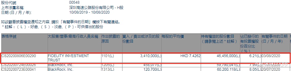 智通财经APP获悉,香港联交所最新资料显示,8月3日,FIDELITY INVESTMENT TRUST增持深圳高速公路(00548)341万股,每股作价7.4262港元,总金额约为2532.33万港元。智通财经APP获悉,增持后最新持股数目为4645.6万股,最新持股比例为6.21%。