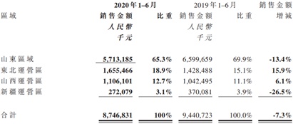 销量增长部分抵消价格下滑影响,山水水泥营收小幅下降。智通财经APP了解到,截至2020年6月30日,山水水泥的水泥产能为10038万吨,熟料产能5107万吨,商品混凝土产能1930万立方米。公司于上半年实现销售水泥、熟料合计2428.8万吨,同比增加1.5%;销售商品混凝土128.4万立方米,同比减少14.6%。不过由于上半年产品整体平均售价下滑,公司整体营收规模还是下滑了7.3%,分区域来看公司最主要的山东区域销售额下滑了13.4%,占比最小的新疆运营区则大幅下滑了26.5%,好在东北和山西运营区分别录得15.9%、6.1%的同比增长。