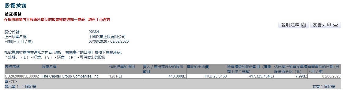 智通财经APP获悉,香港联交所最新资料显示,8月3日,美国资本集团减持中国燃气(00384)41万股,每股作价23.316港元,总金额约为955.96万港元。减持后最新持股数目为4.17亿股,最新持股比例为7.99%。