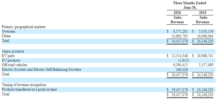 财报显示,该公司第二季度净营收1943.71万美元,较去年同期的2414.62万美元下降19.5%。主要原因是受公共卫生事件影响,电动汽车配件销量下降。