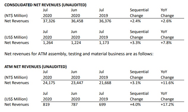 该公司7月净营收12.64亿美元(合373.26亿新台币),环比增长3.3%,同比增长7.8%。7月半导体封测(ATM)净营收8.19亿美元(合241.75亿新台币),环比增长4%,同比增长17.2%。