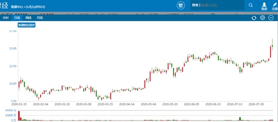 不过在8月10日,九毛九单日突然拉涨12.7%,当日共计4.63亿港元资金涌入成交3173.7万股,量能较前一个交易日放大近1.8倍,15.56港元的盘中高点也大幅抬高了历史高点位置;8月11日,九毛九股价开盘继续冲高,盘中最大涨幅逼近7.5%,虽然收盘有所回落,但16.46港元盘中高点再度刷新了股价记录。