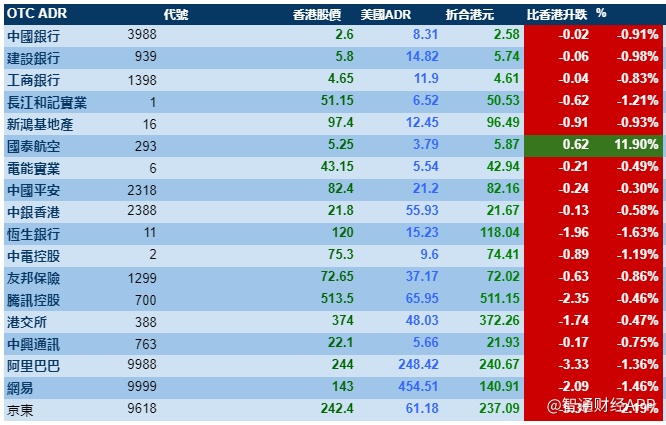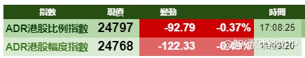 智通财经APP获悉,周二美股三大指数集体收跌,港股ADR指数跟随下跌,按比例计算,收报24797点,跌92.79点0.37%。