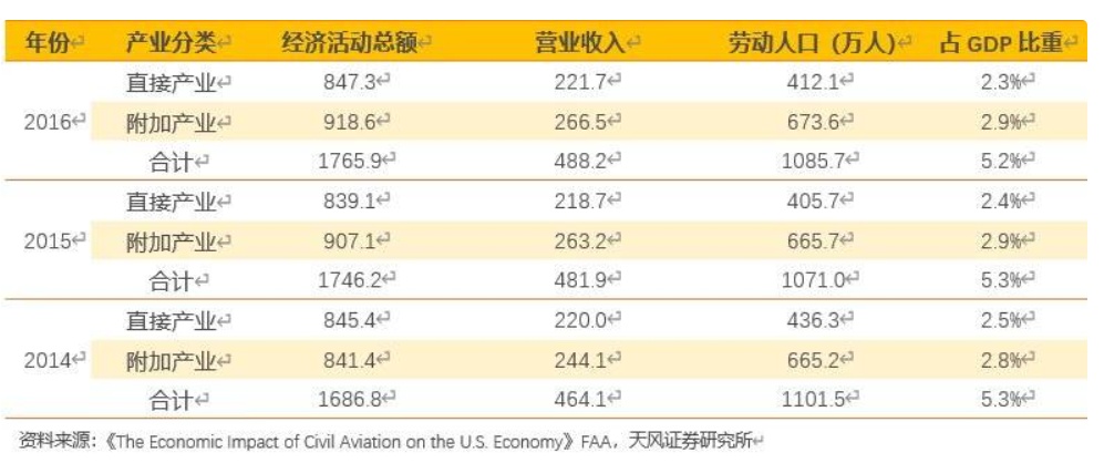 仅在美国,2016年,美国航空产业链相关商品和服务经济活动总额达到1.8万亿美元,创造1090万个就业岗位,创造了4880亿美元的营业收入,全年对美国GDP贡献比重达到5.2%。