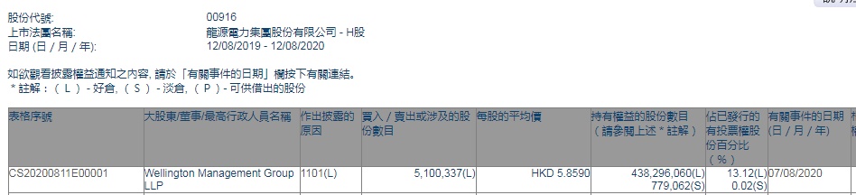 智通财经APP获悉,香港联交所最新资料显示,8月7日,Wellington Management Group LLP增持龙源电力(00916)510.0337万股,每股作价5.859港元,总金额为2988.29万港元。增持后最新持股数目约为4.38亿股,持股比例升至13.12%。