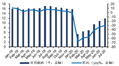 智通财经APP了解到,随着国内公共卫生事件形势逐步平稳,再加上自“618”以来,东方航空、海南航空、春秋航空、四川航空等陆续推出促销活动,套票价格优惠下的高性价比进一步刺激大众出行需求。7月日均航班量和客运量均环比回升,行业客座率改善明显,据民航局数据,7月日均航班量恢复至11941次,环比增10.36%,已达去年同期的7成水平,总旅客运输量3699.56万次,环比增长20.35%,约为去年同期6成水平,客运量增速环比改善幅度领先航班量10个百分点。