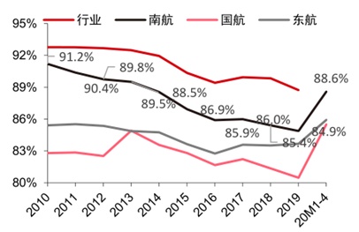 国内线需求复苏加速,内线旅客占比最高的南航有望率先获益。智通财经APP了解到,2010年以来南航国内线客运量占比较国航、东航高8.4至2.8个百分点、5.8至1.2个百分点,持续领先三大航。南航国内线周转量占比同样优势明显,2010年以来南航国内线周转量占比较国航、东航高24.8至7.5个百分点、13.2至4.1个百分点。2020年公共卫生事件严重冲击国际线客流需求叠加五个一政策影响下,2-4月南航、国航和东航国内线旅客占比升至95.6%、92.8%和92.2%,南航仍领先3个百分点左右。因此当下内线需求快速复苏的情况下,国内线旅客发送量和周转量占比最高的南航或率先受益。