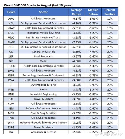 同时,美国Eagle Ford页岩油企的佼佼者阿帕奇石油(APA.US)在过去十年的8月平均回报率为-6.17%,在8月最差表现股票排行榜上位居前列。