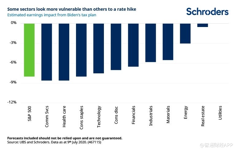 Sean Markowicz表示,在美股板块方面,通信服务、医疗保健和消费类商品行业的盈利受到的影响最大,同时能源、房地产和公用事业行业不会受到实质性影响。但该分析师认为拜登上任的第一年不太可能立即执行税改政策。