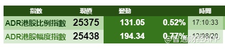 智通财经APP获悉,周三美股三大指数集体上涨,港股ADR指数跟随上涨,按比例计算,收报25375点,升131.05点0.52%。