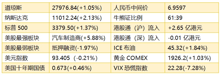 1、特朗普宣布与生物科技公司Moderna(MRNA.US)达成疫苗采购协议,周三美股集体上涨,标普500指数盘中刷新2月收盘记录高位,逼近历史新高。隔夜美股截至收盘,道琼斯指数涨289.93点,涨幅1.05%,报27976.84点;标普500指数涨45.81点,涨幅1.37%,报3379.50点;纳斯达克综合指数涨229.42点,涨幅2.13%,报11012.24点。港股ADR指数跟随上涨,按比例计算,收报25375点,升131.05点0.52%。