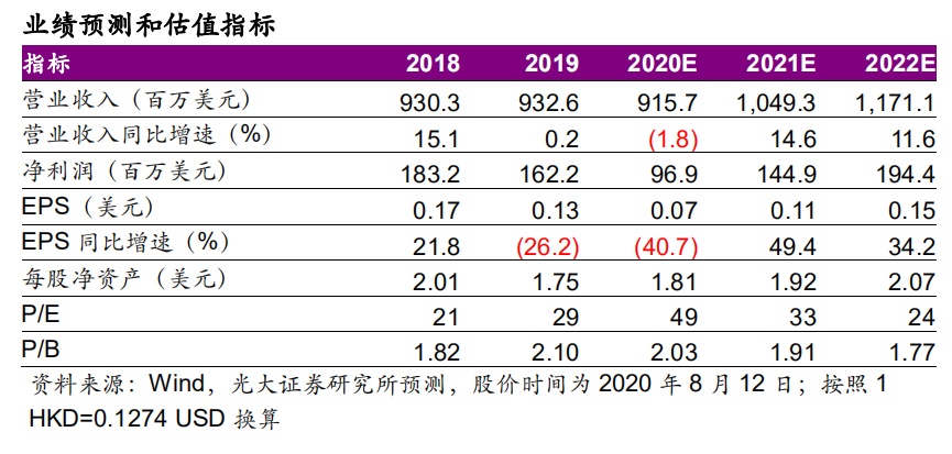 短期内12寸收入贡献低于预期,下调20年净利润预测17%至0.97亿美元;8寸代工行业景气度抬升有助8寸盈利改善,同时12寸规模化贡献收入带来12寸厂亏损收窄将驱动公司整体盈利改善,维持21年净利润预测为1.45亿,新增22年预测为1.94亿。全球晶圆代工行业高景气度背景下,海外同业估值普遍抬升,剔除头部厂商外PB估值区间在1.4-1.9倍PB;华虹整体基本面如期上扬,尽管3Q指引上扬幅度低于市场乐观预期压制短期股价表现,但中长期看12寸引入新产品新客户带来收入及盈利空间显著扩大,后期12寸新产品大幅上量有助市场信心恢复,同时潜在科创板上市预期有助其估值抬升,基于公司未来业绩成长性优于海外同业及潜在盈利提升空间更加广阔,给予20年2.5倍PB,上调目标价至35.5港元,上调至“买入”评级。