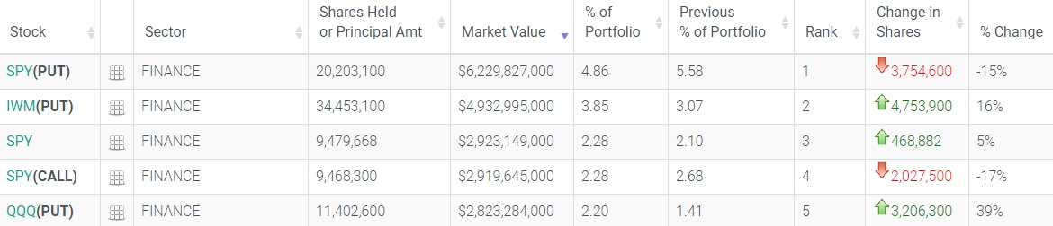 iShares罗素2000 ETF看跌期权(IWM.US,PUT)位列第二,持仓约3445万股,持仓市值约49.3亿美元。较上季度持仓数量增持了16%。