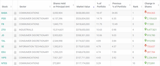 其中,阿里巴巴(BABA.US)位列第一,占比18.47%,持仓约305.1万股,市值约6.58亿美元;拼多多(PDD.US)位列第二,占比14.79%,持仓约613.7万股,市值约5.27亿美元;Facebook(FB.US)位列第三,占比11.75%,持仓约184.3万股,市值约4.19亿美元;中通快递(ZTO.US)位列第四,占比10.63%,持仓约1031.4万股,市值约3.78亿美元;京东(JD.US)位列第五,占比10.06%,持仓约595.4万股,市值约3.58亿美元。