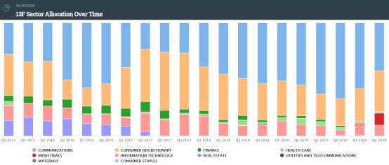 从行业来看,大众传媒行业相关个股依然是景林的重仓标的,占比达42.31%。不过,可以看出,景林在不断缩小该行业在总持仓的份额。其次是非必需消费品和工业行业,分别占36.23%和10.73%。