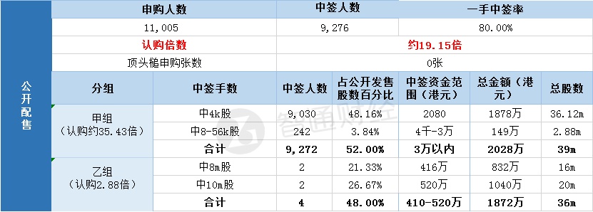 其中,公开配售申购人数11005人,一手中签率80%,认购倍数约19.15倍。
