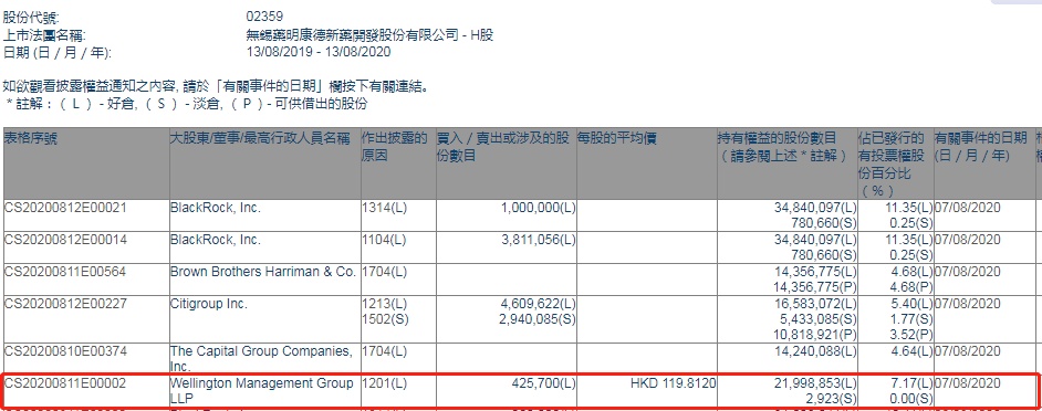 智通财经APP获悉,香港联交所最新资料显示,8月7日,Wellington Management Group LLP减持药明康德(02359)42.57万股,每股作价119.812港元,总金额为5100.39万港元。减持后最新持股数目约为2199.89万股,最新持股比例为7.17%。