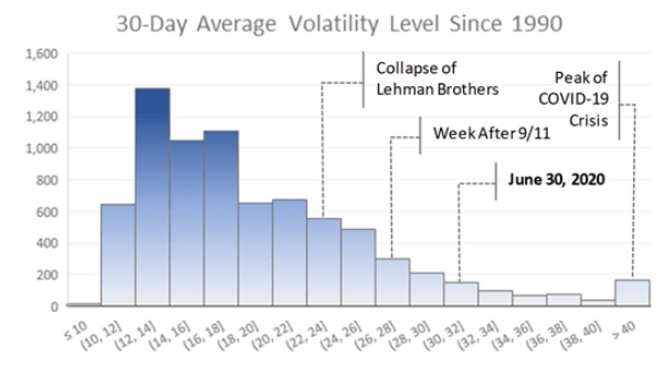 6月30日,标准普尔500指数的隐含波动率仍处于非常高的水平。下面的柱状图显示了1990年以来VIX指数的30日平均水平。在第二季度末,对股市波动的短期预期高于2008年雷曼兄弟(Lehman Brothers)破产前后和9/11袭击后一周。