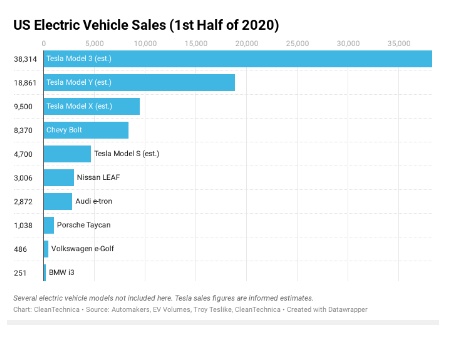纵观2020年的数据,可以很清楚地看到,特斯拉(TSLA.US)仍然在美国电动汽车市场上占据主导地位,据数据显示,在销量惨淡的半年内,特斯拉Model 3的销量约为雪佛兰Bolt的5倍、日产LEAF的13倍、奥迪e-tron的13倍以及宝马i3的152倍。