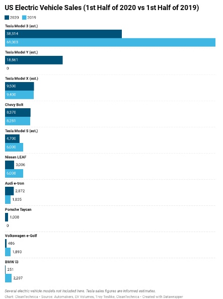 2020年下半年会发生什么?对比上半年美国市场的交付量,特斯拉的产量增长是否足以让下半年焕然一新?今年上半年销量大幅下跌的电动车,是否会在下半年有所反弹?奥迪e-tron或雪佛兰Bolt的销量会出现大幅增长吗?