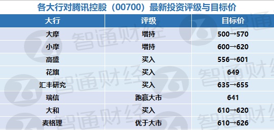 一、各大行对腾讯控股(00700)最新投资评级与目标价