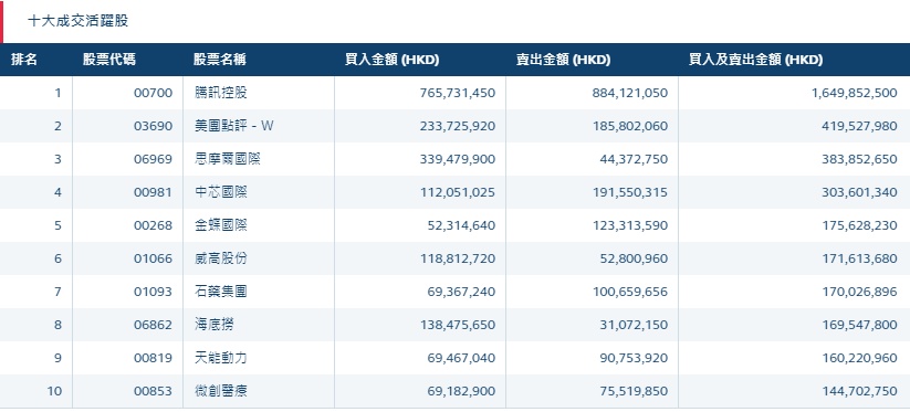 腾讯(00700)获净买入2.89亿港元。消息面上,腾讯昨日发布中期业绩及二季度业绩。中期收入为2229.48亿元人民币,同比增长28%;公司权益持有人应占盈利为620.03亿元,同比增长21%。第二季度收入为1148.83亿元,同比增长29%;公司权益持有人应占盈利为331.07亿元,同比增长37%。绩后各家大行发布研报唱好,高盛上调其目标价至601港元,维持“买入”评级;大和上调其目标价至620港元,维持“买入”评级;麦格理上调其目标价至626港元,重申“优于大市”评级。