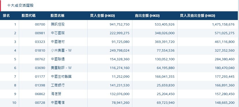 此外,小米集团-W(01810)、威高股份(01066)分别获净买入1.72亿、6601万港元。而中国建材(03323)、中芯国际(00981)、中生制药(01177)分别遭净卖出2.77亿、2.04亿、1.54亿港元。
