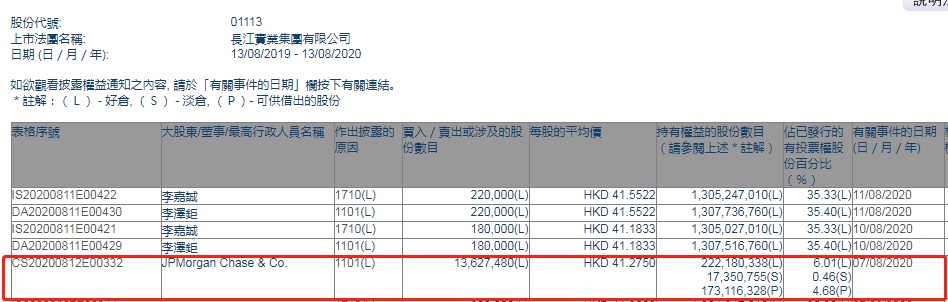 智通财经APP获悉,香港联交所最新资料显示,8月7日,摩根大通增持长实(01113)1362.748万股,每股作价41.275港元,总金额约为5.62亿港元。增持后最新持股数目约为2.22亿股,最新持股比例为6.01%。