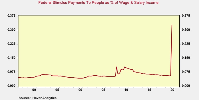 在第二季度,联邦政府支付给民众(包括小企业)的专项支出占到了该季度工资和收入的25%。换句话说,每4美元的工资和收入中,有1美元是从联邦政府的专项支出中获得的。