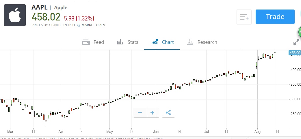智通财经APP获悉,8月13日(周四)美股盘初,苹果(AAPL.US)股价再创历史新高,盘中股价最高见459.63美元。截至21:38,苹果涨1.39%,报458.33美元。