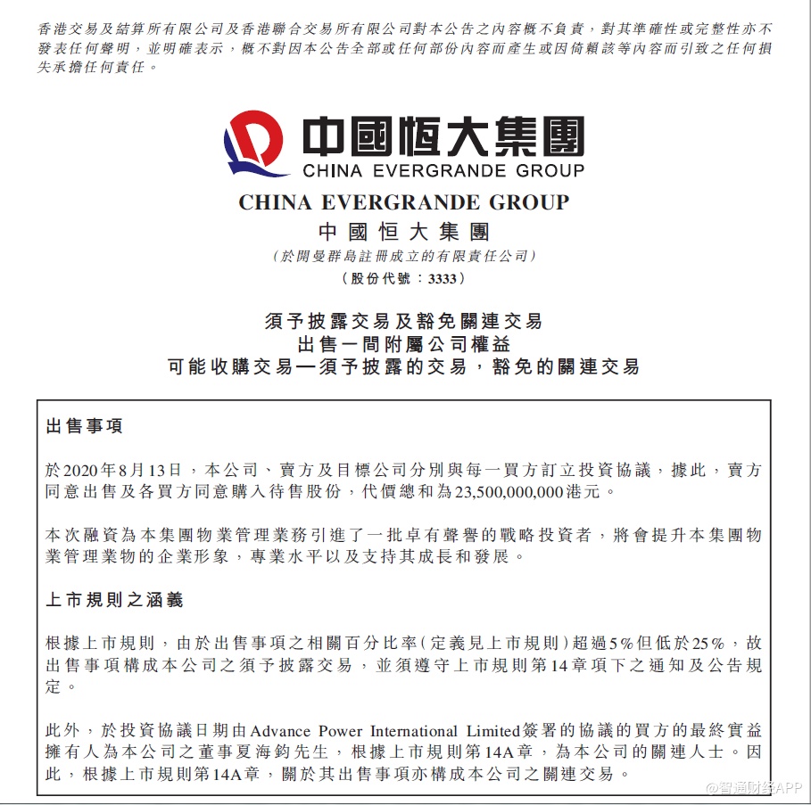 智通财经APP获悉,8月13日晚间,中国恒大(03333)发布公告,旗下物业管理业务将引入235亿港元战略投资。投资者阵容极为“豪华”,包括中信、光大控股等大型央企,云锋基金、红杉资本等顶级投资基金,以及腾讯、周大福等大型企业。