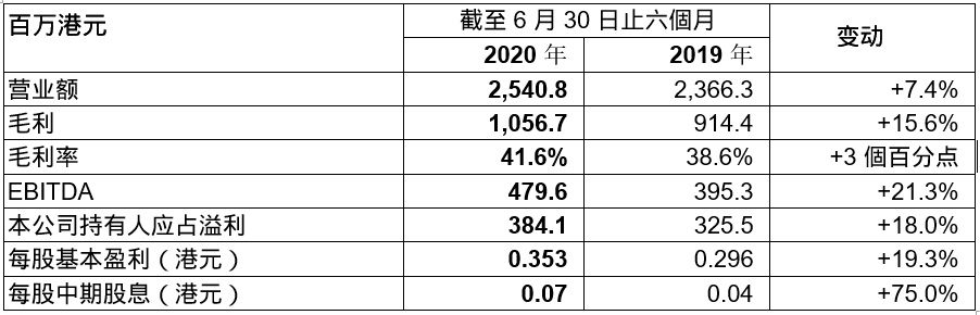 二零二零年上半年,卫生事件席捲全球,对全球各国带来前所未见的经济冲击和挑战。在这艰难时刻,尽管全球经济的不确定性仍然存在,百富凭藉强大的销售网络及以领先的支付产品,令集团的全球业务发展保持良好势头。二零二零年上半年,本集团录得稳健的业务增长7.4%达2,540.8百万港元,总收入为历年中期业绩新高,足以证明百富具备较强的核心竞争力和抗风险能力。受惠于安卓系列产品的销售占比提升,以及人民币贬值,本集团的毛利率由去年同期38.6%上升至41.6%。本公司持有人应占溢利为384.1百万港元,较二零一九年同期大幅上升18%。每股基本盈利为35.3港仙 (二零一九年同期:29.6港仙)。本公司董事会决议宣派中期股息每股普通股7港仙。
