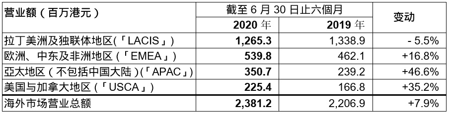 作为全球领先的电子支付终端解决方案供应商之一,百富致力扩大国际布局,目前世界各地许多领先的收单银行和支付服务供应商正採用百富的解决方案。期内,集团的海外市场销售占比进一步提升至93.7%。二零二零年上半年,本集团于海外市场的强劲增长持续,营业总额上升7.9%至 2,381.2百万港元 (二零一九年同期:2,206.9百万港元)。当中以亚太地区及美国与加拿大地区的销售表现最为亮丽,业务增长分别超过40%和30%。来自智能支付终端的销售不断提升,二零二零年上半年的安卓终端销售占集团总收入超过25%。