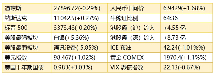 1、周四,美国上周首领失业人数虽跌穿100万人,惟新一轮纾困方案的谈判持续僵持,道指偏软;大型科技股涨幅收窄,纳指一度倒跌。截至收盘,道琼斯指数跌80.12点,跌幅0.29%,报27896.72点;标普500指数跌7.60点,跌幅0.22%,报3372.75点;纳斯达克综合指数涨30.27点,涨幅0.27%,报11042.50点。港股ADR指数偏弱运行,按比例计算,收报25107点,跌122.92点或0.49%。