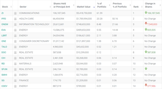 持仓偏好来看,本季度,凯雷新买入互联网营销公司ZoomInfo(ZI.US)1.06亿股,持仓占比61.39%,位列第一。PPD(PPD.US)持仓占比为20.28%,位列第二;1Life Healthcare(ONEM.US)持仓占比为8.48%,位列第三。