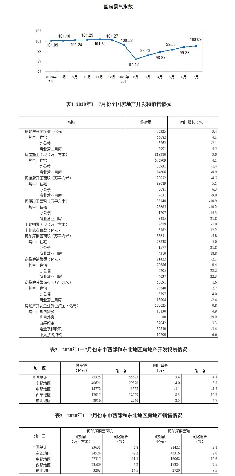 7月份,房地产开发景气指数(简称“国房景气指数”)为100.09,比6月份提高0.24点。