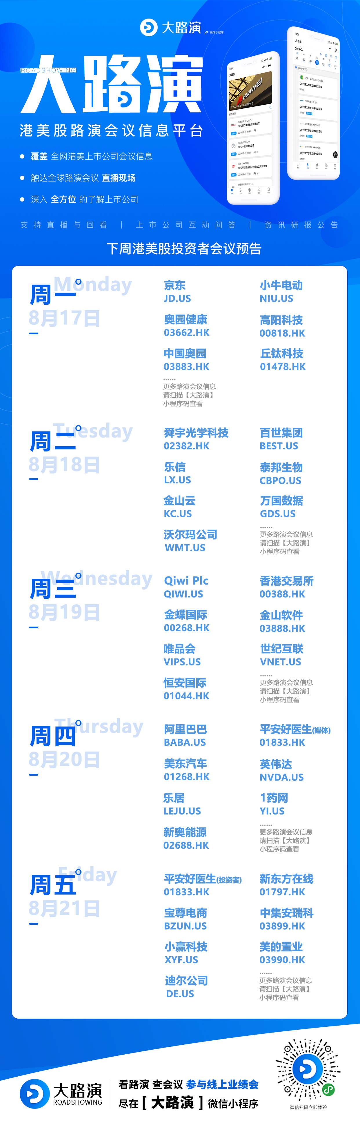 以下是智通财经“大路演”为您整理的下周(8月17日-8月21日)港美股上市公司会议日历。