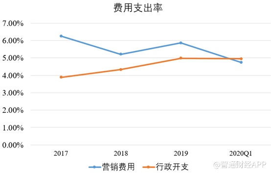 第一财季联想集团销售费用、行政费用分别为6.32亿、6.61亿美元,费用支出比分别为4.74%、4.95%,合计9.69%,同比下降了1.29个百分点。主要是因为营销费用比明显下降,环比看期内营销费用率也处在近几年最低。