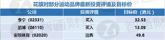 目前花旗维持李宁“买入”评级,目标价32.53港元,行业中继续青睐李宁及滔搏(06110),滔搏评级为“买入”,目标价看13.09港元,安踏评级则为“沽售”,目标价49.6港元。