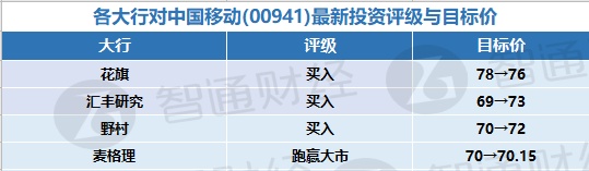 三、各大行对中国移动(00941)最新投资评级与目标价