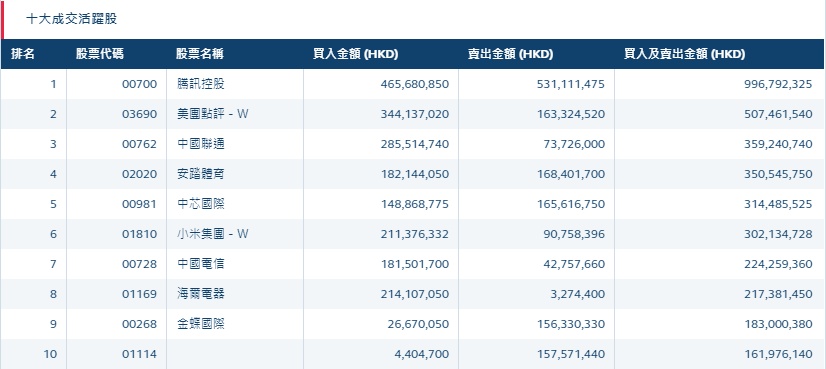 此外,海尔电器(01169)、安踏体育(02020)分别获净买入2.1亿、1.15亿港元。而天能动力(00819)、中芯国际(00981)、新东方在线(01797)分别遭净卖出1.06亿、1857万、1306万港元。