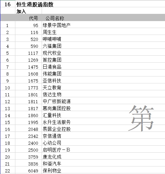 恒生港股通指数将新加入如下标的: